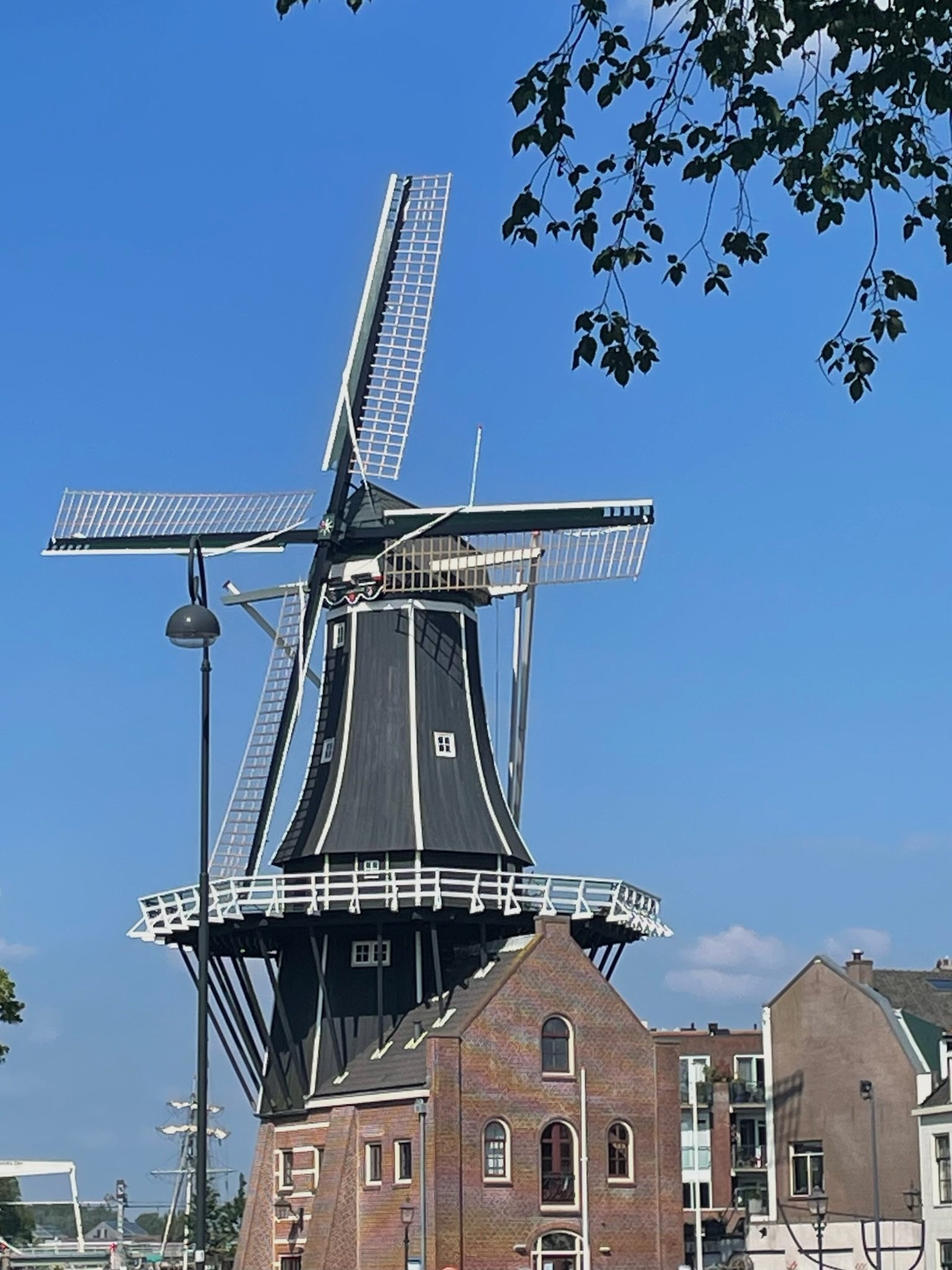 Once we returned our bikes, we wandered through a sunlit Haarlem, admiring the windmill and stumbling across a strange dome-like building. At first we assumed it to be an arena, like a concert hall, but then suddenly Nicolas realized it for what it is— a panopticon. Now, in case you are flummoxed, assuming, as I did, that a panopticon is some sort of Greek all-you-can-eat buffet, I’ll hasten to enlighten you with what Nicolas shared. A panopticon is a prison where the control center is in the center of the building, which allows few guards to keep an eye on all inmates, without the inmates knowing if they are being observed. This supposedly would encourage good behavior, as inmates would always behave as they would when under supervision. Panopticons were built all over the world, but only a few remain. This one in Haarlem was built in 1901 and fell into disuse in 2016. Since then it was used as place to house asylum-seekers and now is a hip office space with a coffee bar on the ground level and a movie theater below.