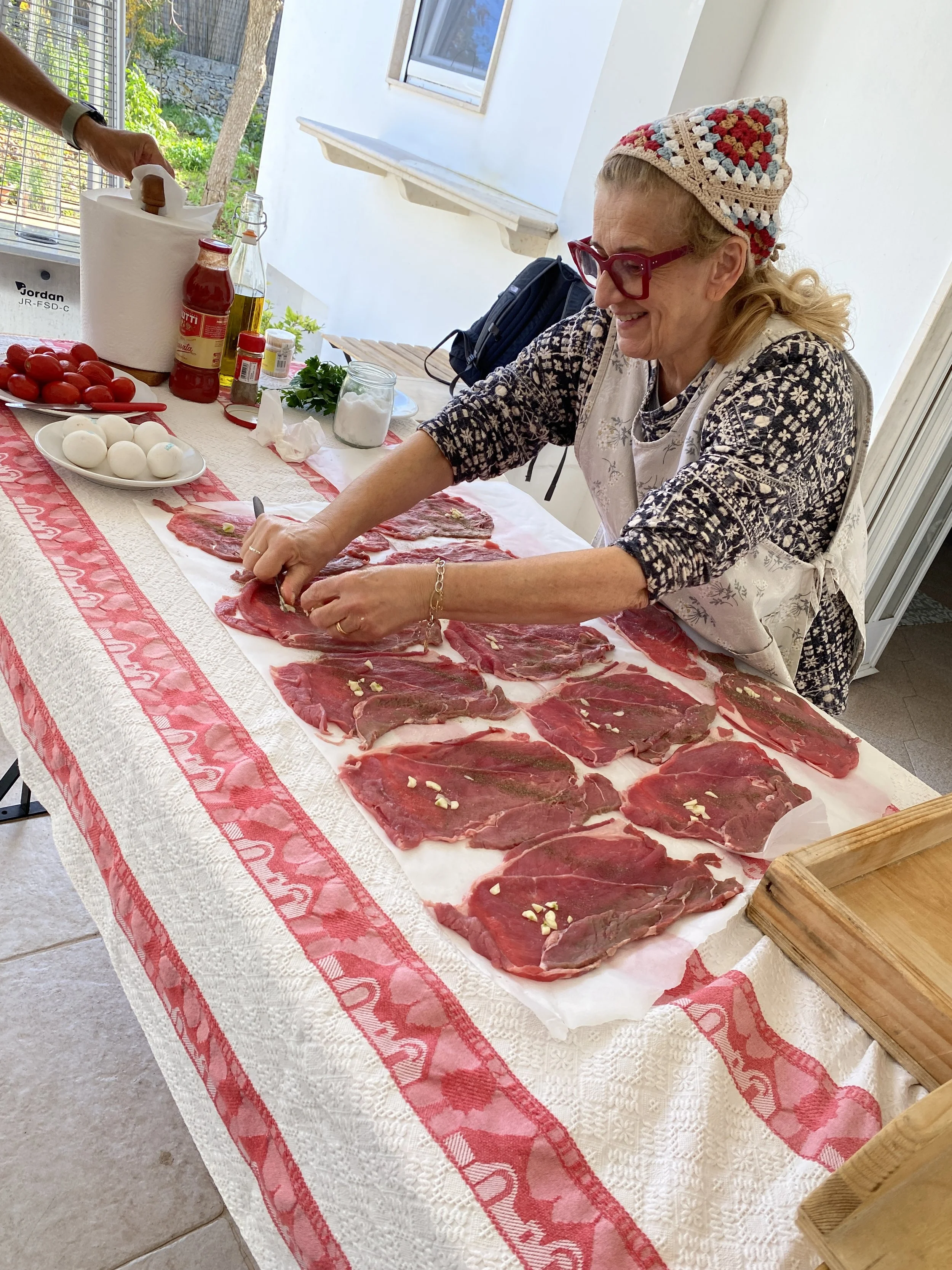 Soon we were tearing bread for fried bread balls (which I suggested we rename “cheese balls,” given how Antonella’s “pinch” of grated cheese escalated into “entire container”). We rolled orecchiette—handy practice before my stay on Via delle Orecchiette in Bari. We kneaded focaccia enriched with a boiled potato and its cooking water, a trick I’m convinced must be a state secret. And we rolled veal to simmer in tomato and wine until the kitchen smelled like the dictionary definition of comfort.