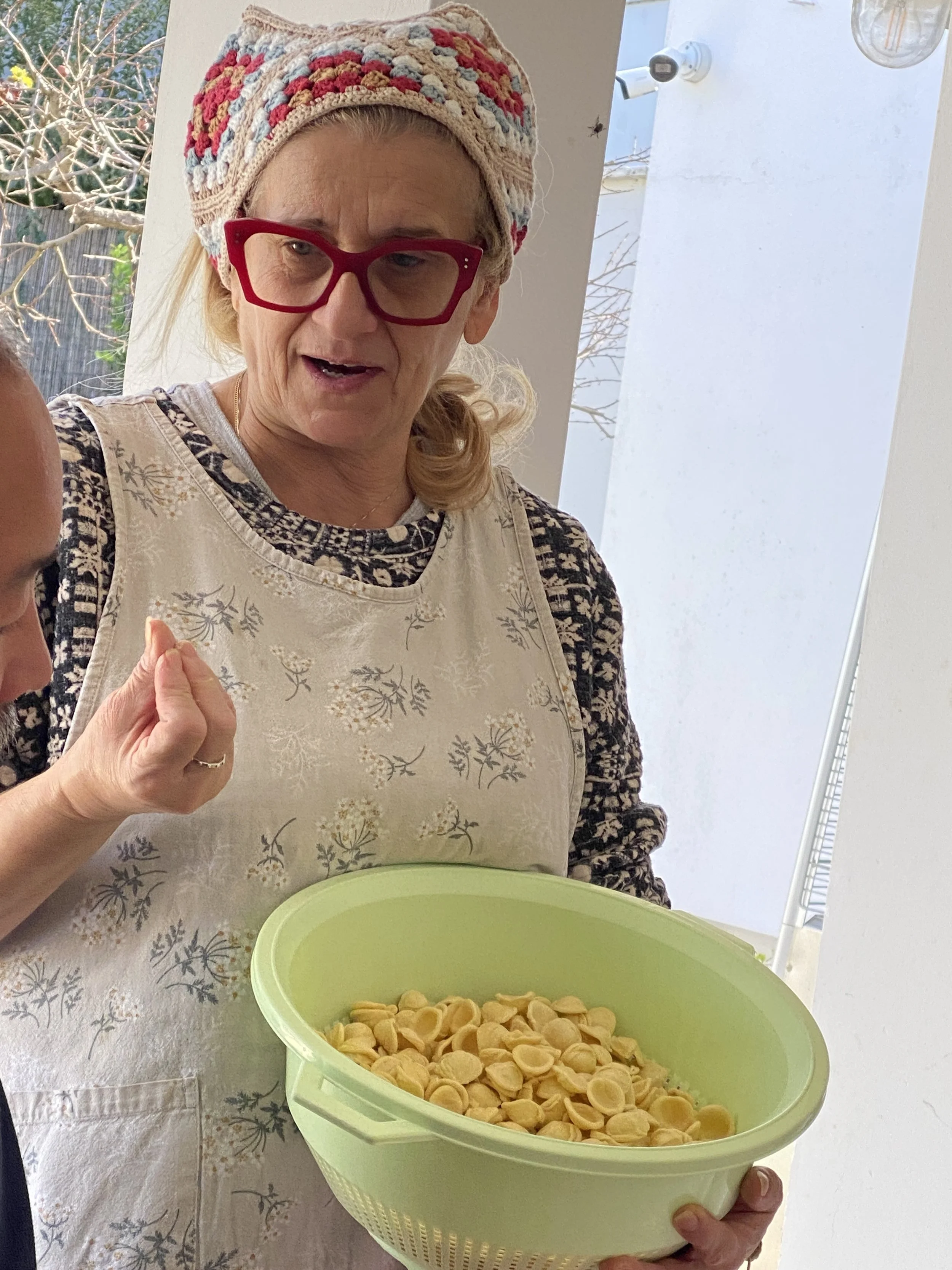 Not only because the food was sublime (though, yes), and not only because we cooked it in a trullo and sat in the garden with a heart-stopping view, but also because we got to take part in the cooking. Antonella, a friend of Mimmo’s mother, guided us, apron on, crocheted kerchief holding back her hair, speaking not a word of English but fluent in hospitality.